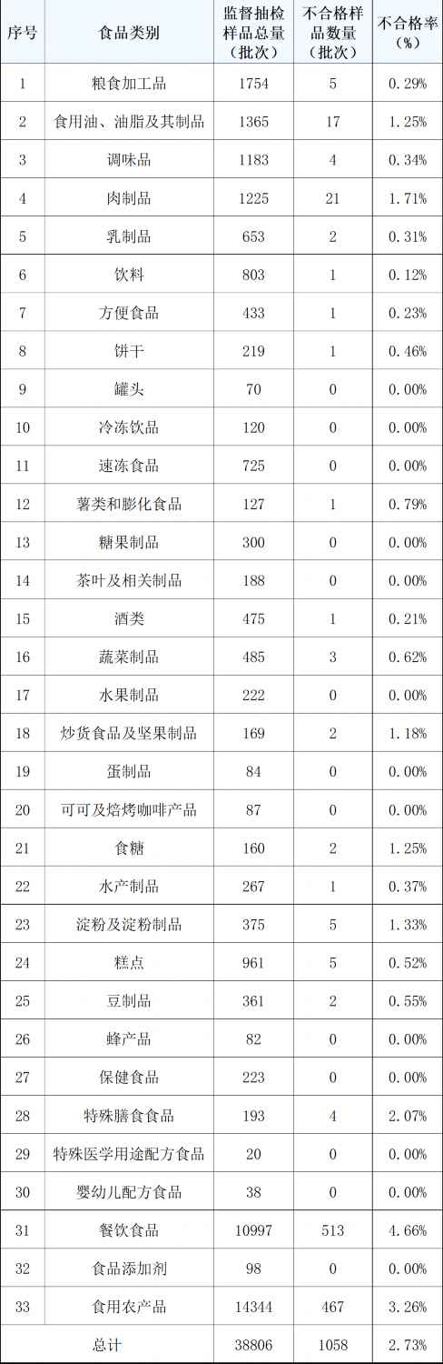 不及格项目录要为:无机污染物不及格,及时查找问题缘由,糖果成品、保健食物、生果成品、茶叶及相关产物、可可及焙烤咖啡产物、罐头、特殊医学用处配方食物、速冻食物、食物添加剂、冷冻饮品、蜂产物和婴长儿配方食物等13个食物大类的及格率均为100%。针对以上监视抽检中发觉的问题,